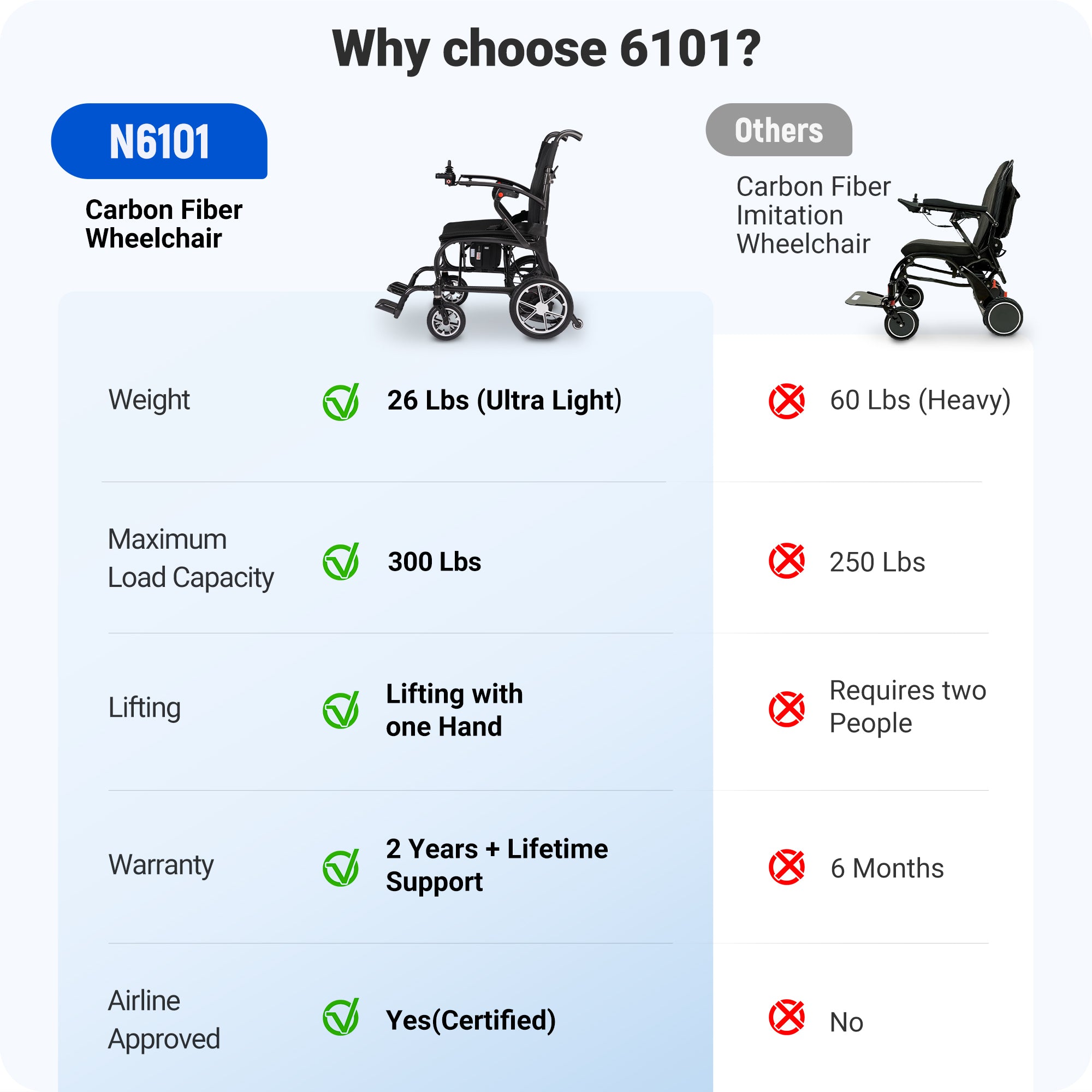 The adult electric wheelchair is made by 100% carbon fiber and it weighs only 25.8 lbs (not included Batteries) which is the lightest electric wheelchair. Its quick 1-second fold allows for easy storage in various vehicle trunks, and it can be effortlessly dragged like a suitcase.